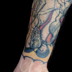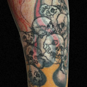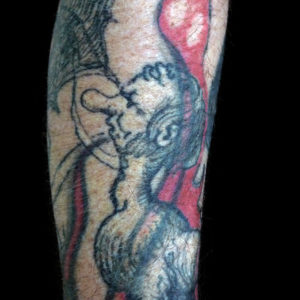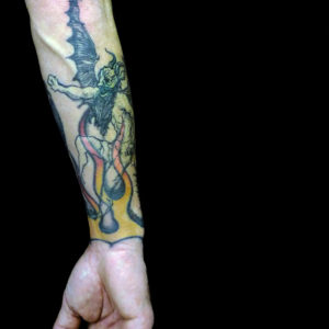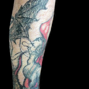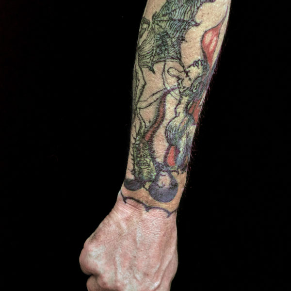A présent, il y a une maison en feu, des légumes cruels qui vagabondent, des chimères, des serpents et des diables. C’est un travail de longue haleine, puisqu’il a offert son corps entier à mon expérience du tatouage, hormis ses fesses et son sexe. Voir vidéos en bas de la page.