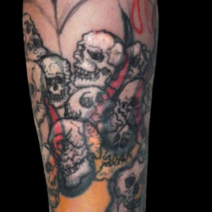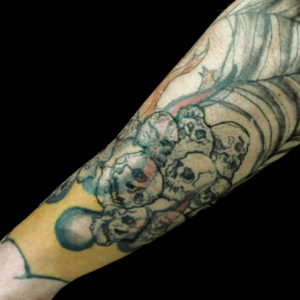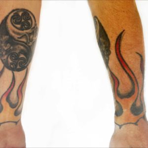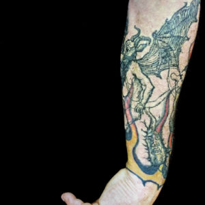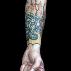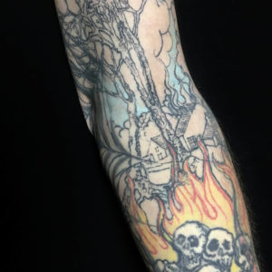 Ce travail est le fruit d’une proposition, celle d’un ami qui souhaitait faire transformer des tatouages existants, des flammings et un motif circulaire sombre inspiré du Yin-Yang. Il voulait des crânes. J’ai accepté, mais en lui proposant d’étendre le motif pour tatouer Les Enfers. Il m’a laissé entièrement libre sur le choix des motifs. J’ai intégré les flammes à l’ensemble plutôt que de les faire disparaître, et l’ancienne boule sombre est en train de se fondre en une forêt.